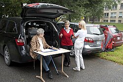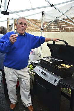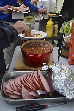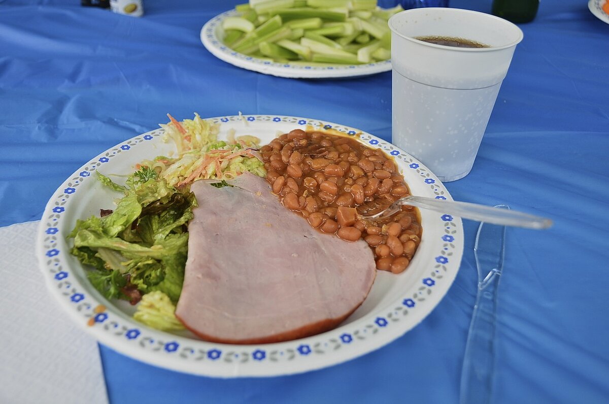 Jambon de Virginie : cette précieuse pièce de viande sera accompagnée de fèves au lard, de salades et autres amuse-gueules appropriés, le tout arrosé de vin, de bière, d’eau et de café. Un gâteau clôturera ce banquet. Les responsables de la bouffe ont choisi, autant que possible, des mets sans allergènes.