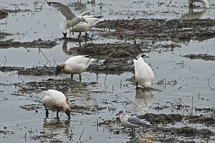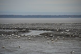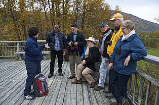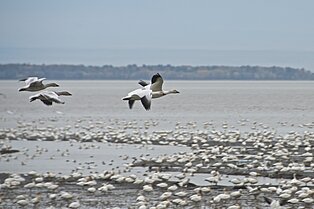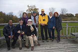 Huit participants et participantes ont profité des explications de la guide sur la naissance des oies, leur croissance rapide, leurs voyages et leur arrêt au Cap Tourmente pour se nourrir. Elles s’arrêtent pour manger les rhizomes de scirpe qui poussent dans les marais sur le bord du fleuve.