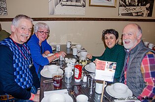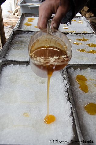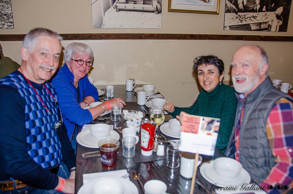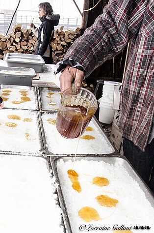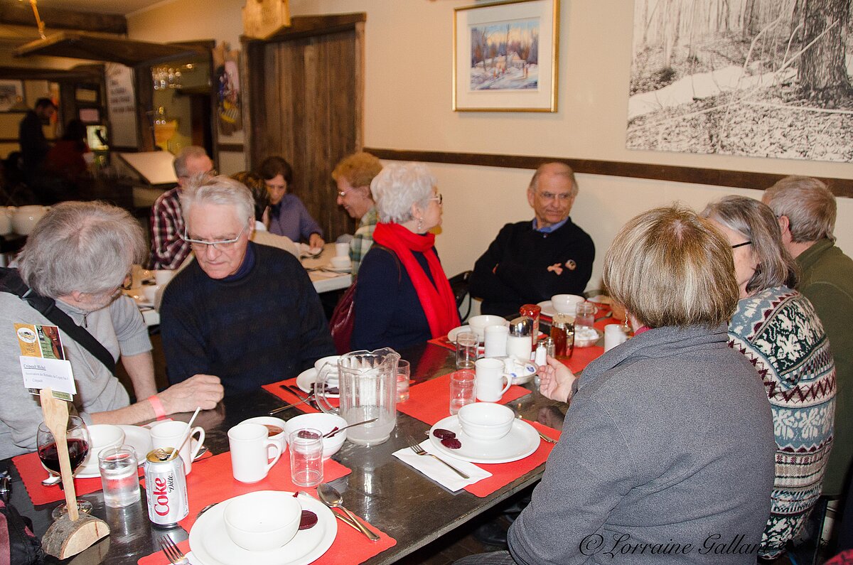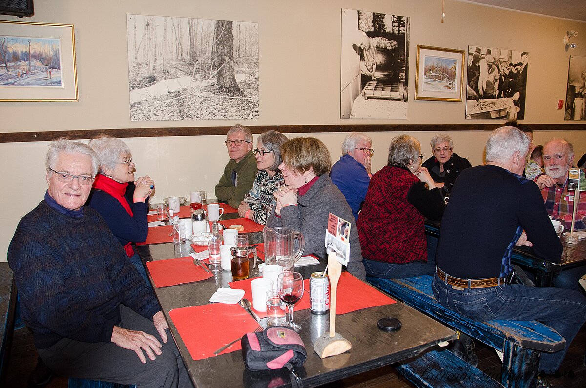 Quatorze personnes se sont rendues à Saint-Augustin, par une journée pluvieuse, pour déguster un bon dîner du temps des sucres et goûter à la tire d'érable fraîchement étendue sur la neige.