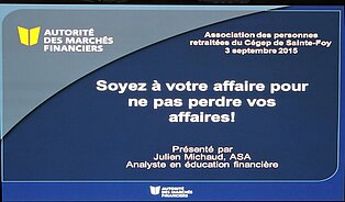 Vingt et un membres ont assisté à la conférence de Julien MICHAUD, actuaire associé, de l’AMF. L’Agence nationale d'encadrement du secteur financier a été créée en décembre 2002 pour remplacer et intégrer la Commission des valeurs mobilières et le Bureau des services financiers. Le nom fut changé pour Autorité des marchés financiers (AMF) en décembre 2004. Sa mission est de protéger les investisseurs, d’encadrer le secteur financier québécois – sauf les banques canadiennes – et d’informer les citoyens et citoyennes. L’AMF reçoit plus de 100 000 appels par année. En plus du centre d’information, l’AMF produit des publications, gère des sites internet et offre une équipe de conférenciers.
