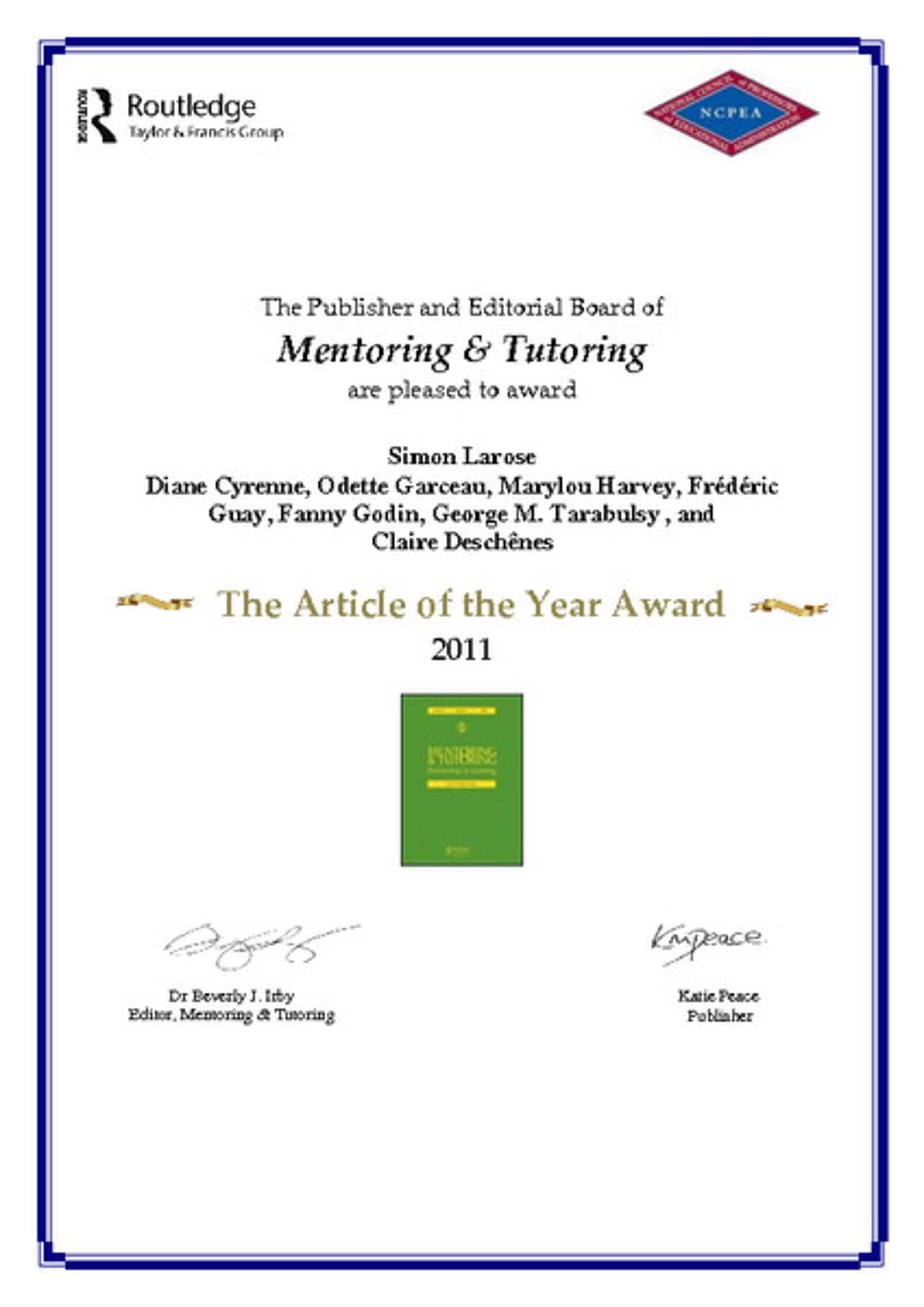 La revue Mentoring and Tutoring: Partnership in Learning a décerné le prix de l’article de l’année 2011 à un professeur de la Faculté des sciences de l’éducation et à son équipe. Simon Larose,Diane Cyrenne, Odette Garceau, Marylou Harvey, Frédéric Guay, Fanny Godin, George M. Tarabulsy et Claire Deschênes ont reçu cet honneur pour leur article « Academic Mentoring and Dropout Prevention for Students in Math, Science and Technology ». Leur recherche examine les effets à court terme d’un programme de mentorat conçu pour prévenir le décrochage scolaire en mathématique, sciences et technologies. Elle révèle que les étudiants en sciences au collégial réussissent mieux leur première année lorsqu’ils sont accompagnés par un mentor de l’Université, sélectionné parmi les finissants en sciences et génie.