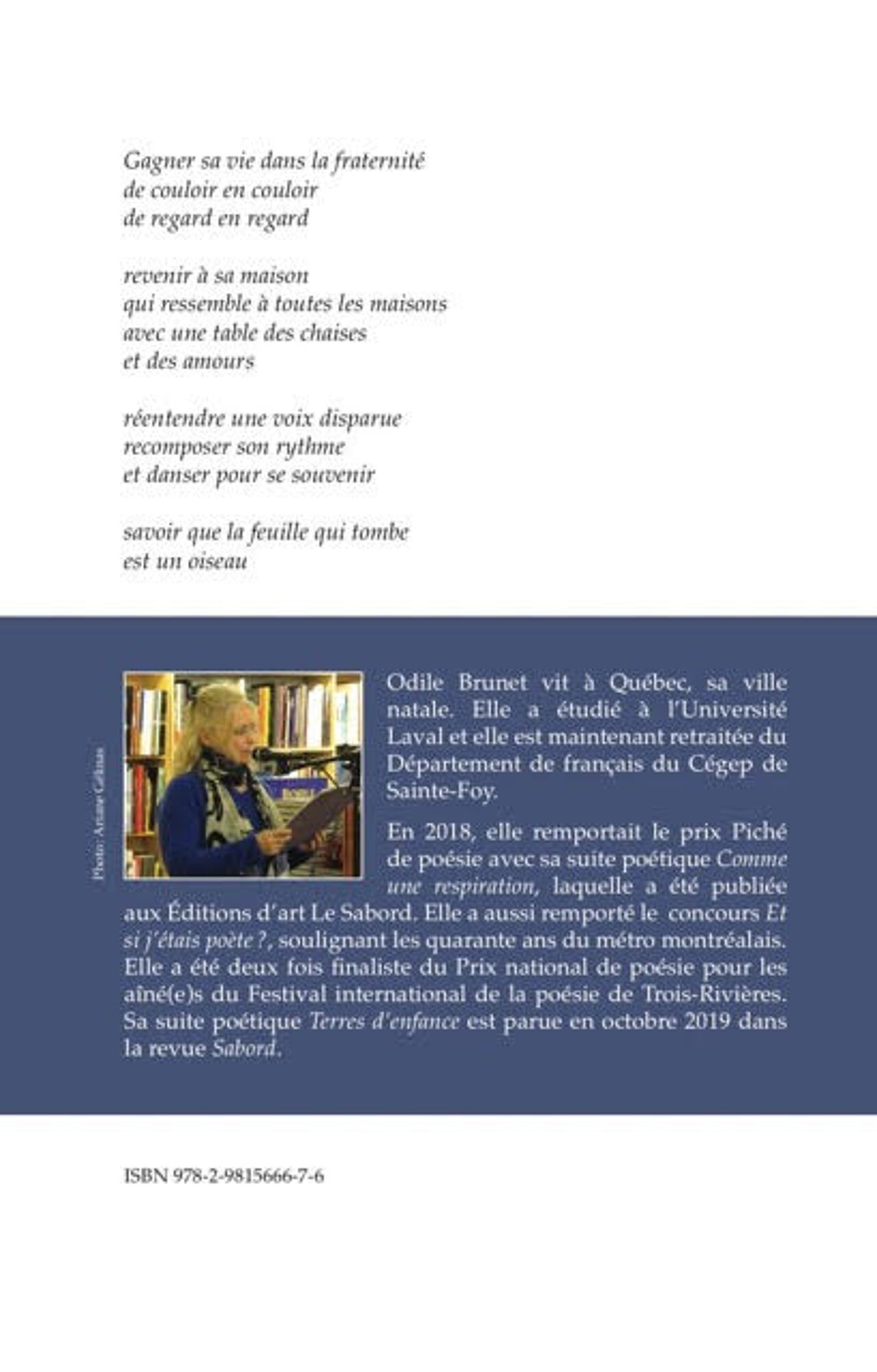 Odile BRUNET a mérité le Prix Piché de poésie de l’UQTR pour sa suite poétique intitulée Comme une respiration. Elle recevra le Prix le 28 septembre 2018 lors de la cérémonie d’ouverture du Festival international de la poésie de Trois-Rivières. Comme une respiration sera publié par les Éditions d’art le Sabord et un lancement aura lieu à Québec le jeudi 8 novembre 2018.