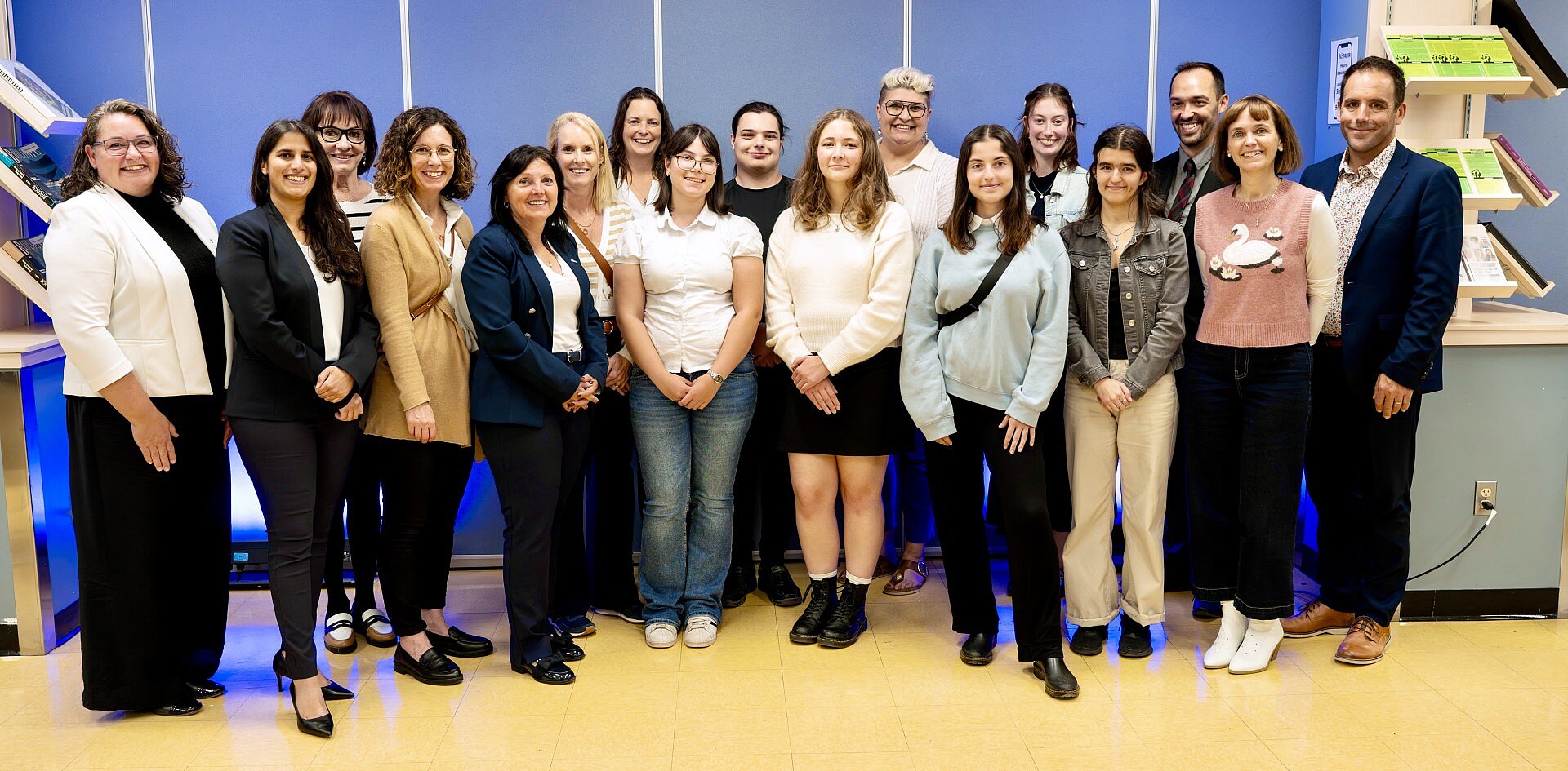 De gauche à droite : Nathalie Larose, directrice générale du Cégep de Sainte-Foy, Alisha Wissanji, fondatrice de L'École des Grands, Marie Bélanger et sa fille de la Fondation Diane Bélanger, Sonia Lefrançois, directrice de la Fondation du Cégep de Sainte-Foy, Véronique Hébert, directrice générale de la Fondation Atura, Catherine Montour, directrice générale de l'Instance régionale de concertation - Gouvernement du Québec, Sophie-Emmanuelle Genest, directrice des études du Cégep de Sainte-Foy, Steven Verreaut, directeur adjoint Métro Ferland - Supermarché Ferland, Amélie-Elsa Ferland-Raymond, enseignante et responsable du projet de l'École des Grands au Cégep de Sainte-Foy et Benjamin René, directeur adjoint aux études du Cégep de Sainte-Foy, accompagnés d'étudiantes et étudiants du Cégep, et mentors pour L'École des Grands.