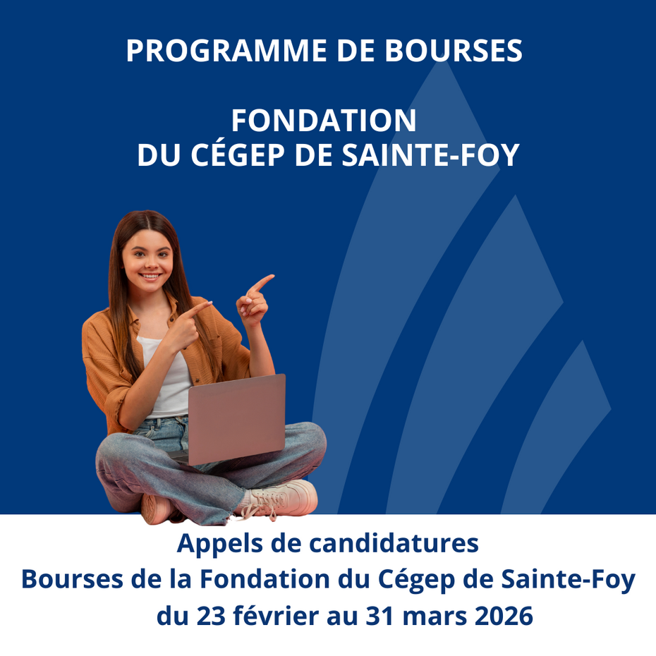 Chaque année, la Fondation du Cégep de Sainte-Foy offre un large éventail de bourses destinées à soutenir et à reconnaître l’engagement, l’excellence, la persévérance et la réussite des étudiantes et étudiants du Cégep. Plus de 1 000 bourses, d’une valeur totale de plus de 275 000 $, sont attribuées chaque année dans différentes catégories : bourses avec dépôt de candidature, bourses d’aide financière, bourses d’engagement, bourses de persévérance, bourses d’excellence, bourses de mérite artistique et culturel, bourses de mérite scolaire, bourses de mérite sportif, bourses de mobilité, ainsi que bourses liées à des événements et concours.