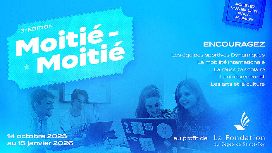 Ravie du succès obtenu les deux dernières années, la Fondation du Cégep de Sainte-Foy est heureuse d’annoncer le retour de son Moitié-Moitié en soutien à la communauté collégiale du Cégep de Sainte-Foy. Cette troisième édition se déroulera du 14 octobre 2025 au 15 janvier 2026.